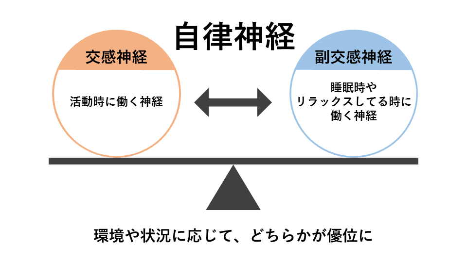 自律神経には、アクセルに例えられる交感神経と、ブレーキに例えられる副交感神経があります。交感神経は、勝負やトラブル対応の時に優位になります。一方で副交感神経は、身体の回復をする時に優位になります。環境や状況に応じてどちらかが優位になり、交感神経と副交感神経が、リズミカルに動くシーソーのように、ちょうどいいバランスで切り替わっているのが、理想的です。